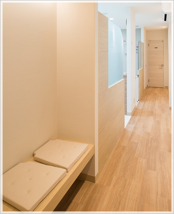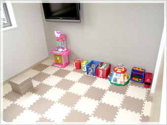 | 診療スペース側にも待合がございます。 | お子様連れの方でも安心。 お子様が楽しめるスペースが用意されております。 |